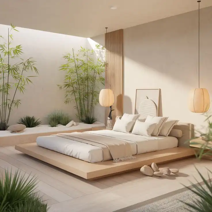 Minimalisme apaisant, matériaux naturels, atmosphère calme et harmonieuse.